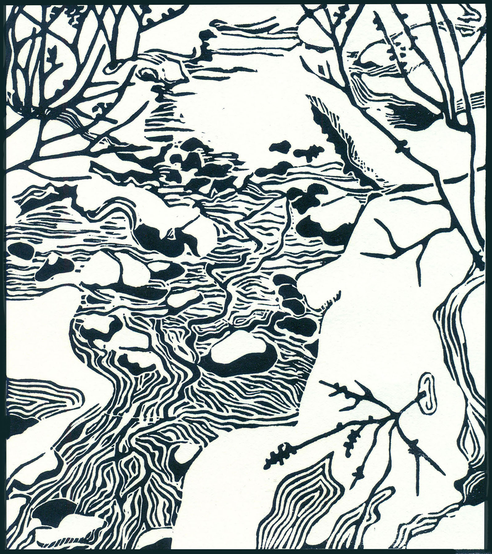 The silence of freshly fallen snow, a silence cut only by the gentle murmur of the stream weaving through the snowbanks.