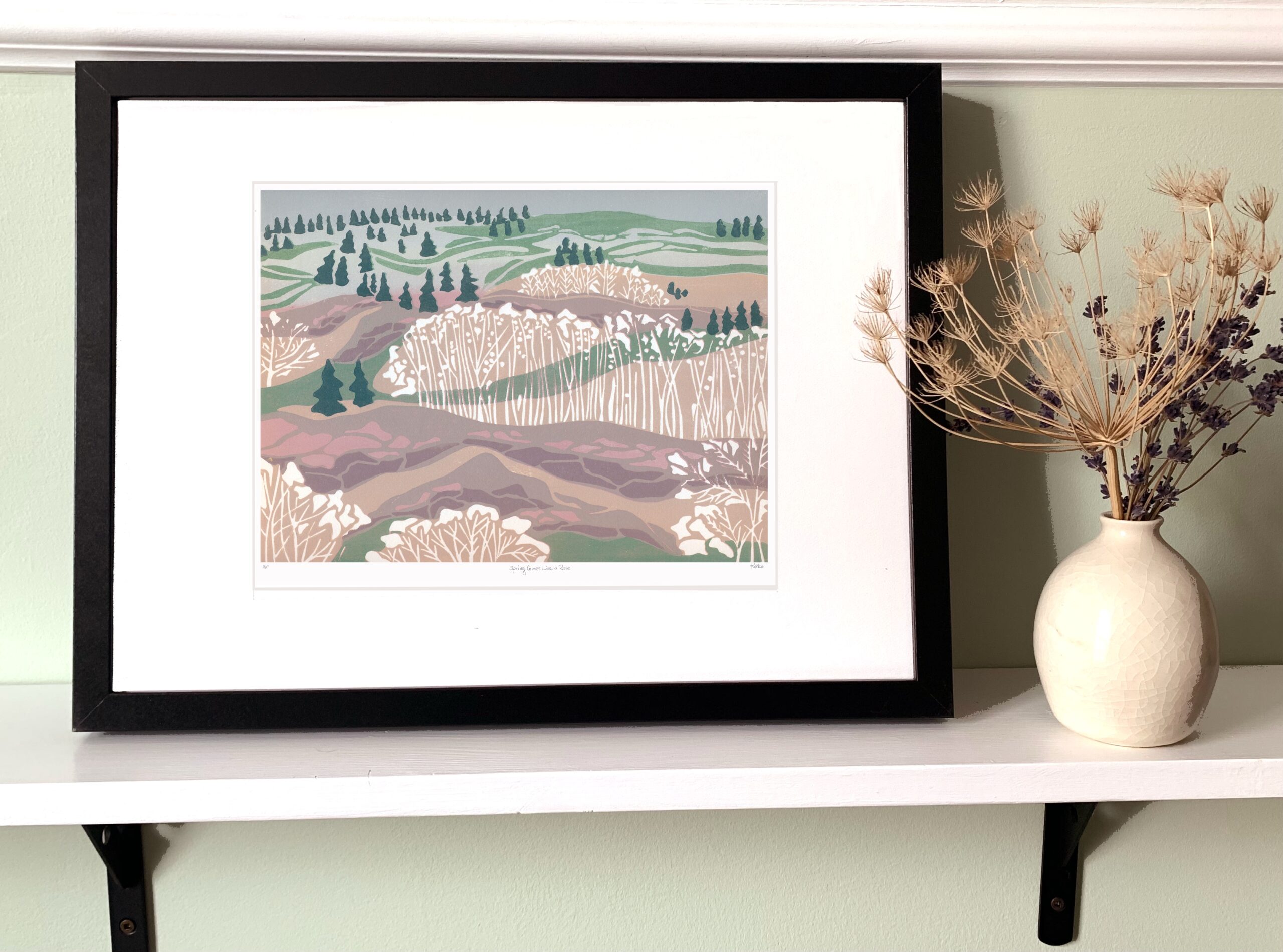 A limited-edition reduction linocut, each colour layer carved individually and printed individually, by hand from a single block.