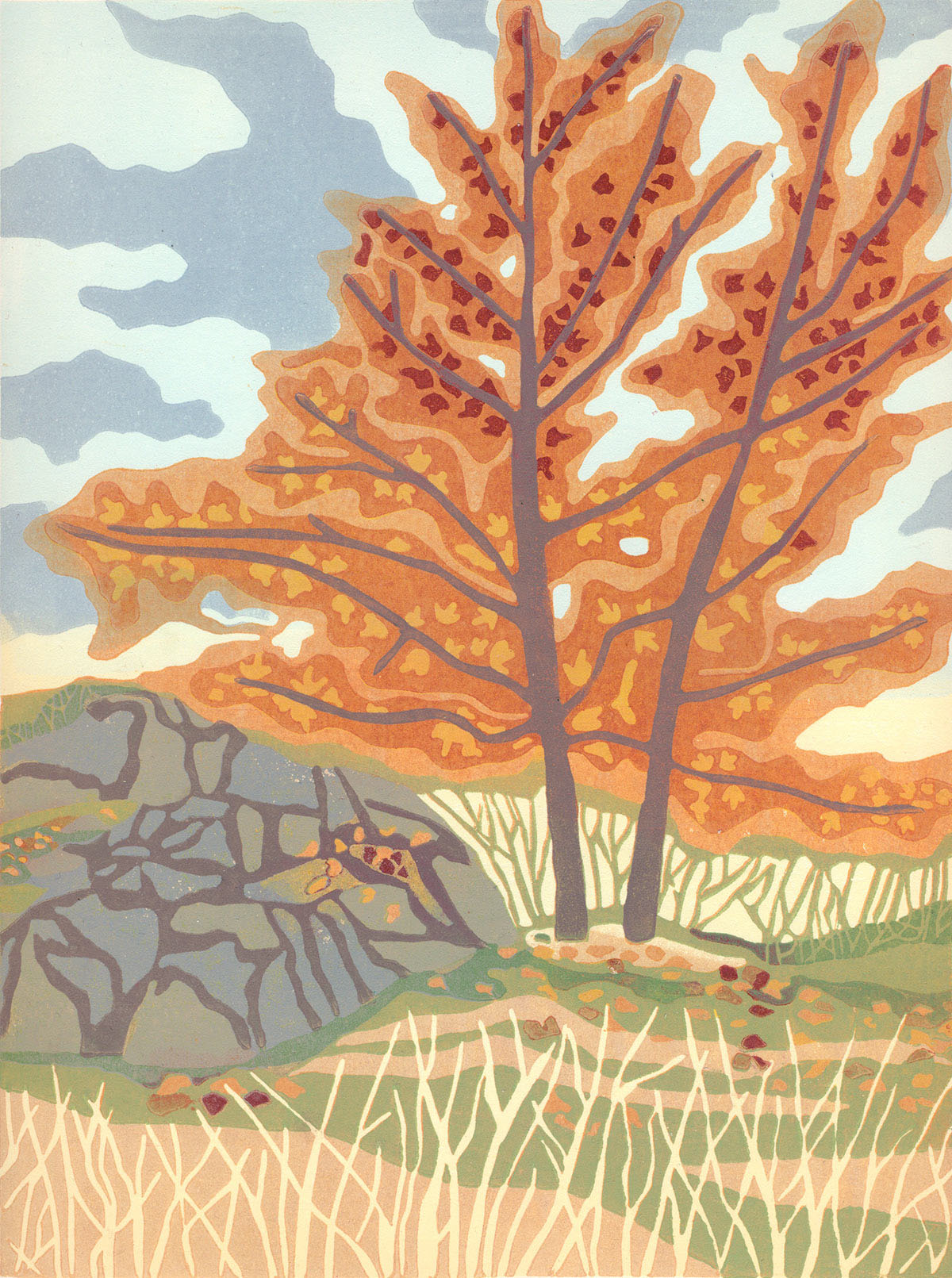 This print is inspired by a beautiful maple tree on a wild trail near to my home. I walk past it almost everyday, all year long, and watch it change with the seasons. A beautiful tree year-round, it’s at its most majestic in the fall when, illuminated by the sun, it shines in a blaze of colour.