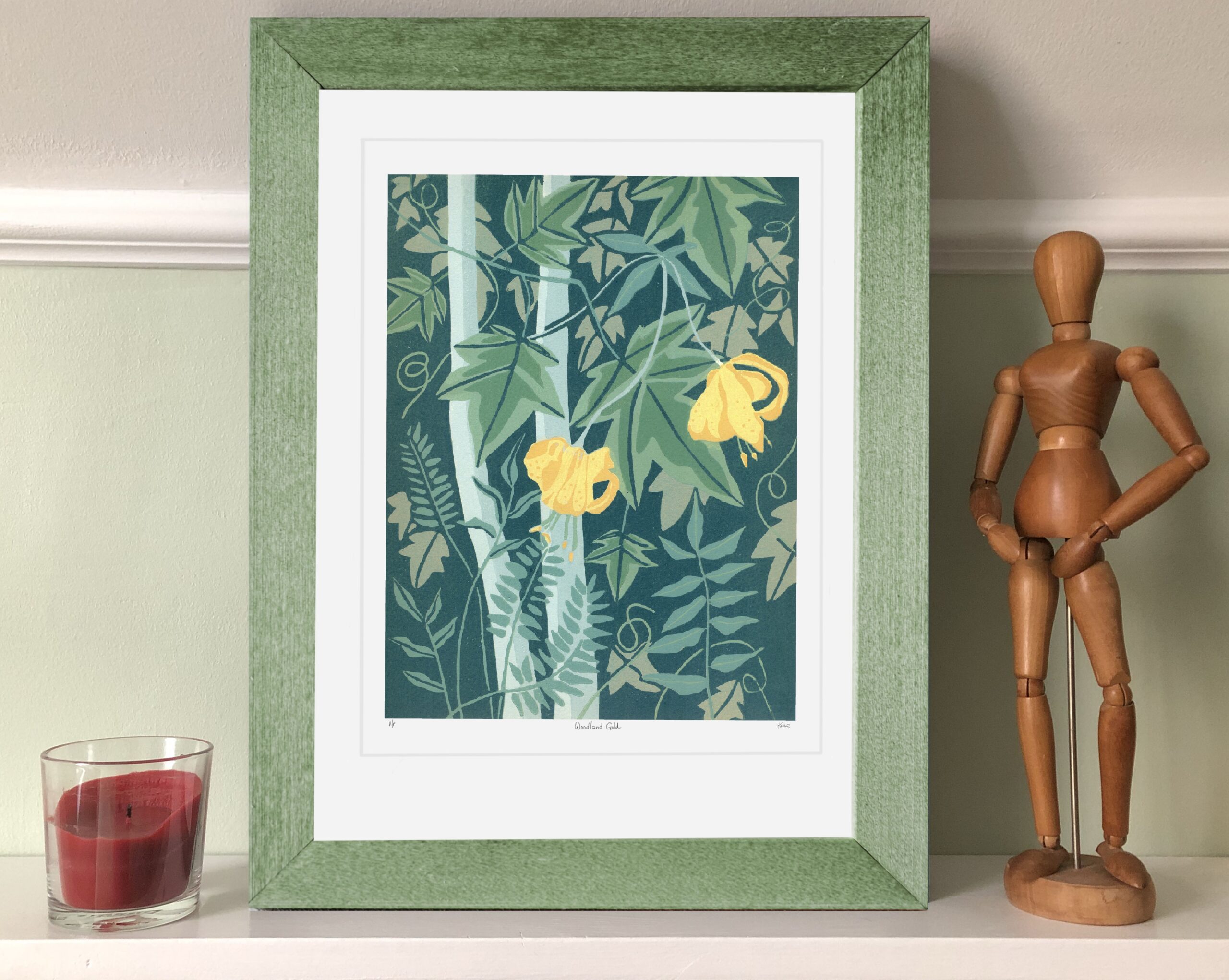 The inspiration for this print came from the woodland near my home in summer. The Columbia Lily is native to this region and I saw them shining from the foliage along the trail, like gold.